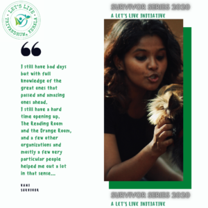 Through the Survivor Series 2020, we share 30 stories of survival from September 10,2020 to October 10 , 2020 – voices from across India speaking about struggle, recovery, and resilience. Our hope was simple: that every story would remind someone that they are not alone.