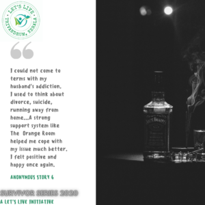 I started speaking to a few close friends about the issues at home and then I never felt alone. I reached out to a few mental health professionals for help. And , one day, I met Sherin, the founder of Let’s Live and attended the sessions organised by her. I heard similar stories from a few people who attended the sessions there and realised I was not alone. A strong support system like The Orange Room, helped me cope with my issue in a much better way. I felt positive and happy once again. This new found energy helped me convince my husband and get him to start treatment for alcoholism and the fight is on. It will take many years probably but I am hopeful and positive that he will gain total control one day.